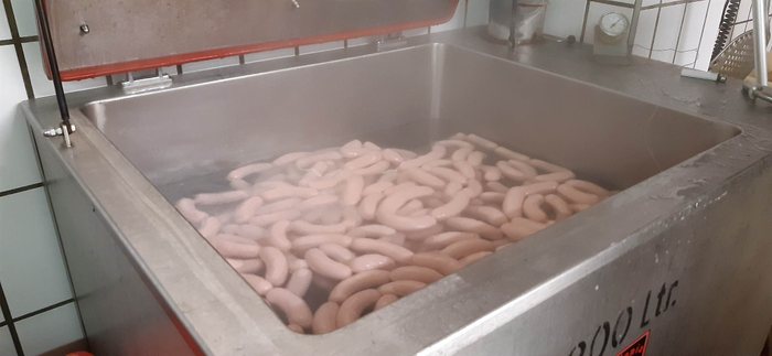 c) Brühen: Das Wasser muss 80 Grad heiß sein. In dieses Brühbad kommen die Würste 20 Minuten. Ein Gewicht sorgt dafür, dass alle UNTER Wasser sind.
